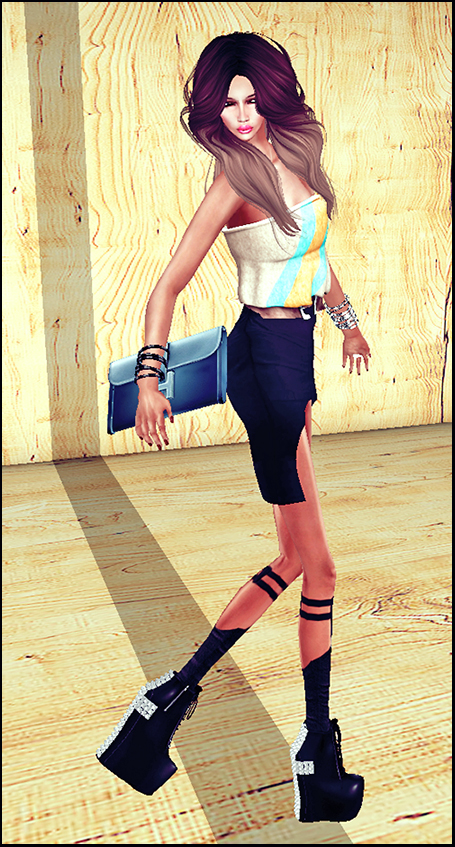 First, here's the new skin from vive9, Maliah! I purchased her in the darkest tone available, which is SPF308, aka DeepExpresso. Maliah is SO beautiful! The bone structure is out of this world. The lips need no cosmetics, but there are some available, of course! I've dressed her in many things since I got her yesterday, but this is the most fitting getup so far. She's got a really innocent look, and so she looked odd, to me, in my SWAG stuff. I'm very interested in seeing what other bloggers do with her. I'm sure she's already been dressed up in so many ways; I've just got to get around to viewing them! So there are the nine usual suspects (skin tone packs), and each package, you get five skins (the base skin; three with light brown, brown and black brows; and one with no brows), an eyebrow shaper, six beauty mark layers, a freckles layer, a cat-eye makeup layer, and a deep blush layer! That's for 1,095L. Then, there are makeup (eye AND lip) and cleavage add-ons. I bought a line of the lipsticks for 175L, with three lipsticks inside of the pack. I have a feeling that I will wear this skin out; I'm just warning you!